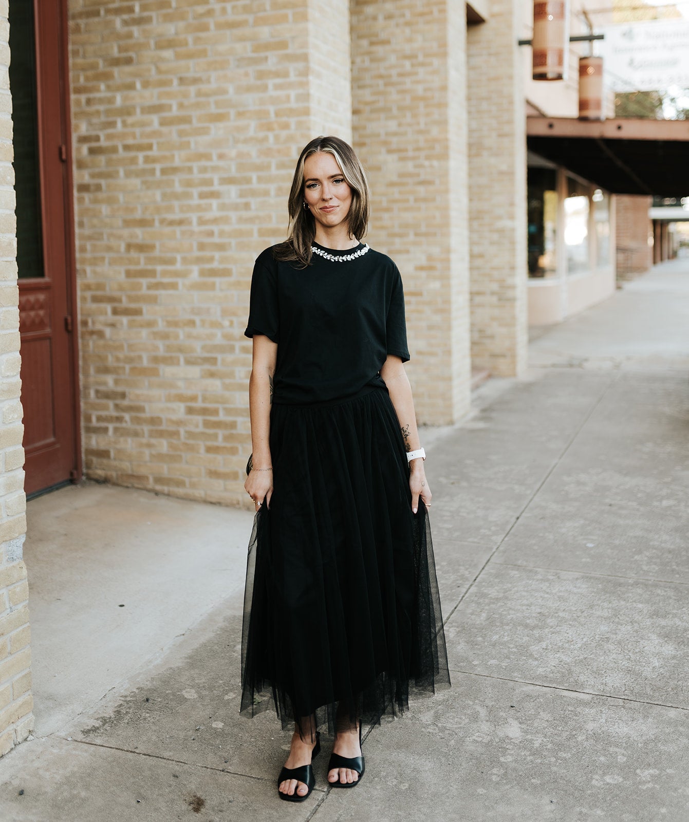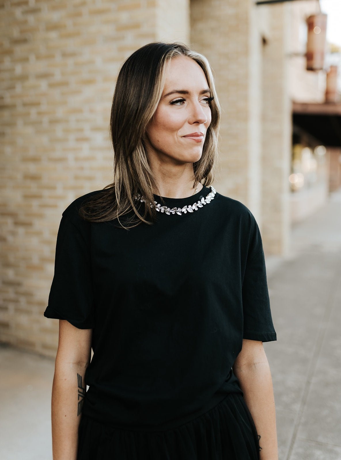 A classic tee with a touch of sparkle — the Black Embellish Tee is the perfect way to elevate your everyday look. With its soft cotton feel and eye-catching neckline detail, this top adds just the right amount of shine whether you’re dressing it up or keeping it casual.