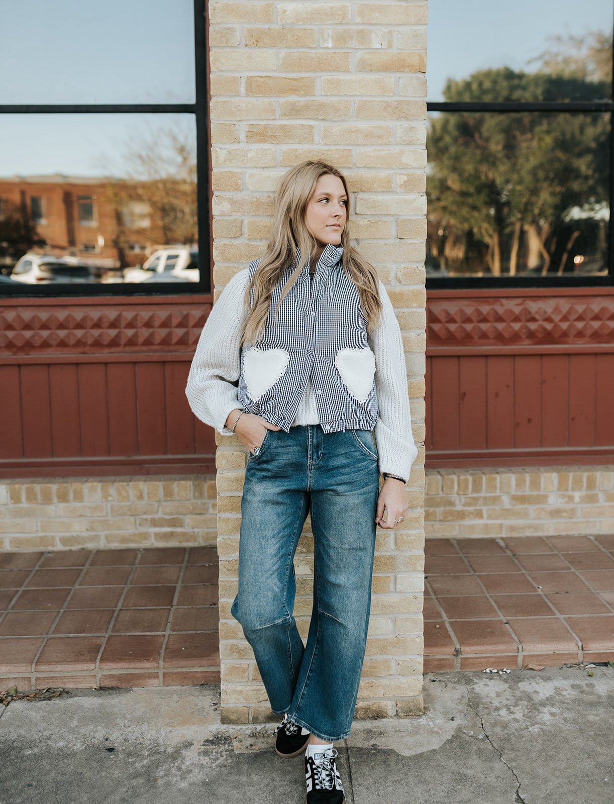 Playful yet practical, this gingham puffer vest brings a fun statement to your layering game. With its oversized fit and charming heart-shaped pockets, it adds personality while keeping you warm and comfortable.