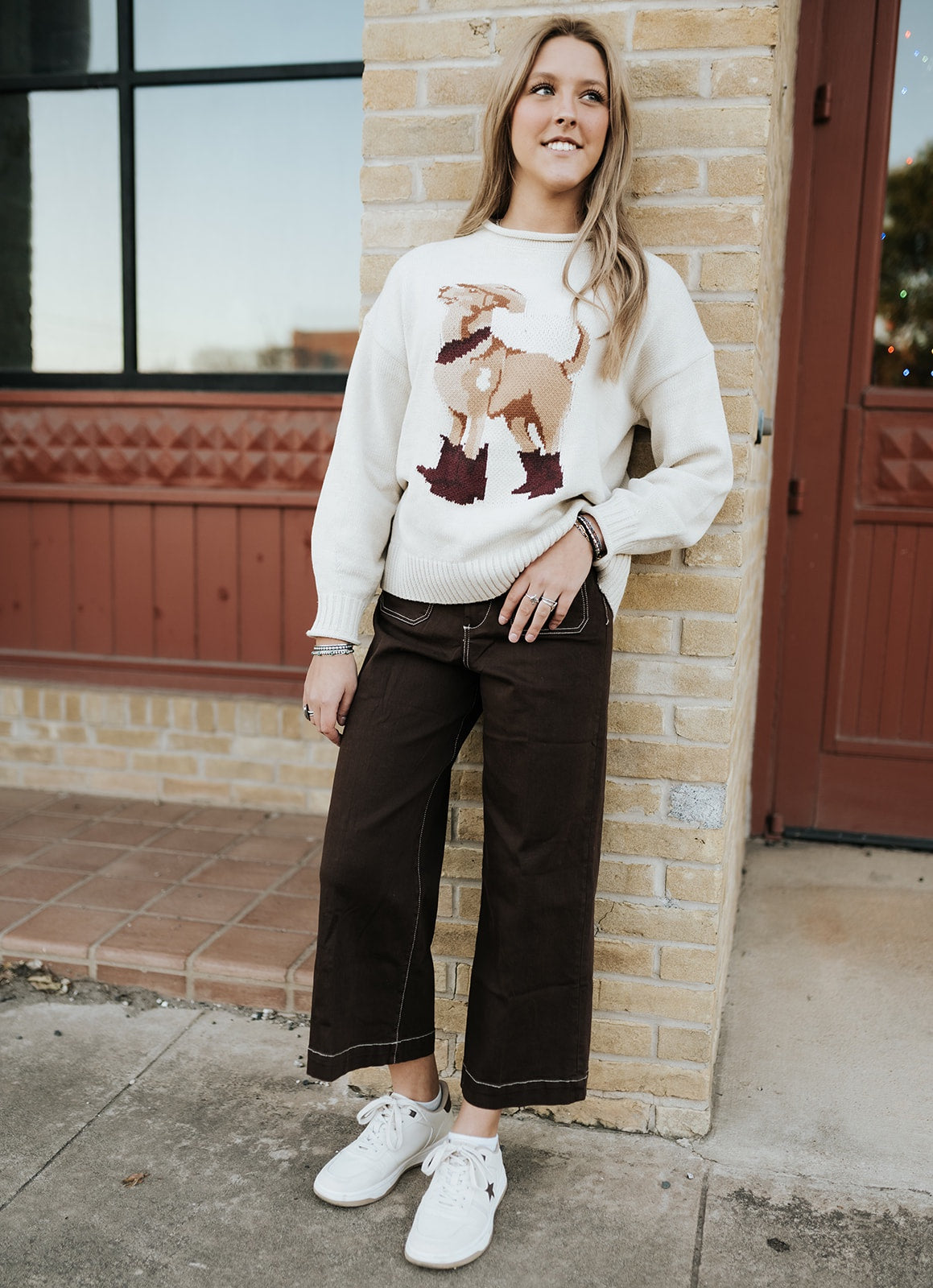 Perfect for everyday wear with our Taupe Western Dog Sweater, bodysuits, or tees. Style with sneakers for a casual look or boots to dress it up.