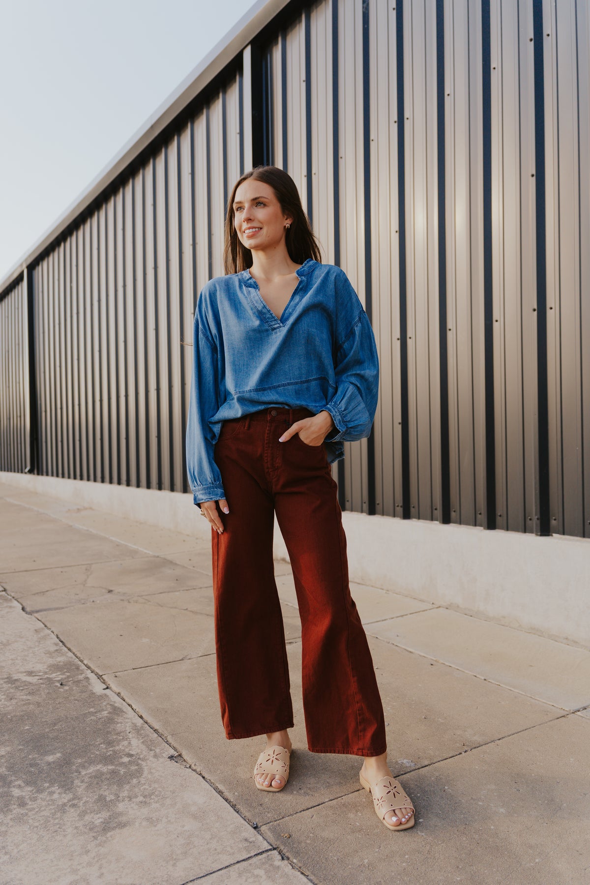 A fresh spin on classic denim. The Cinnamon Barrel Jean brings bold color and a modern silhouette to your everyday wardrobe. Designed with a high rise and cropped barrel leg, these jeans balance structure with comfort in a 100% cotton weave.