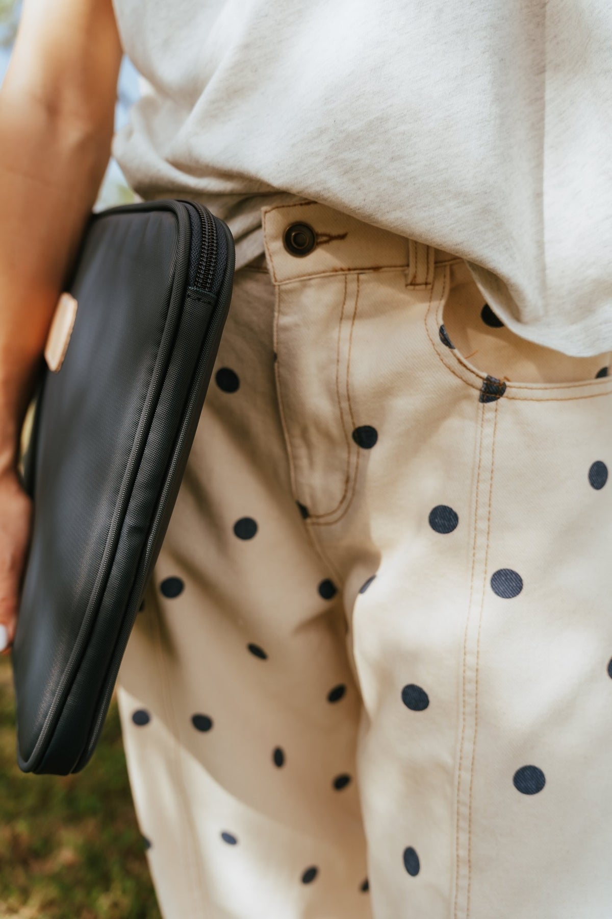 Make a playful statement with these wide-leg denim pants in a creamy neutral base splashed with bold navy polka dots. They're giving vintage charm with modern attitude!