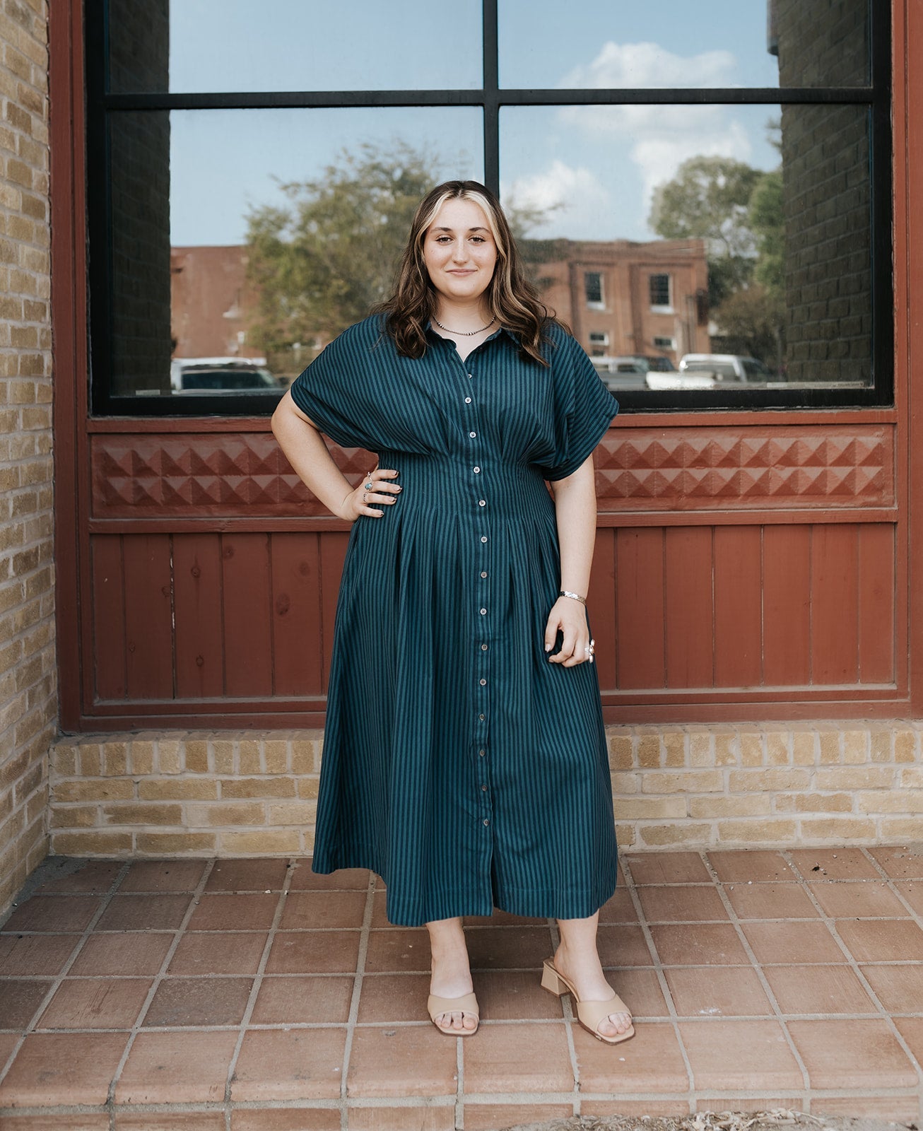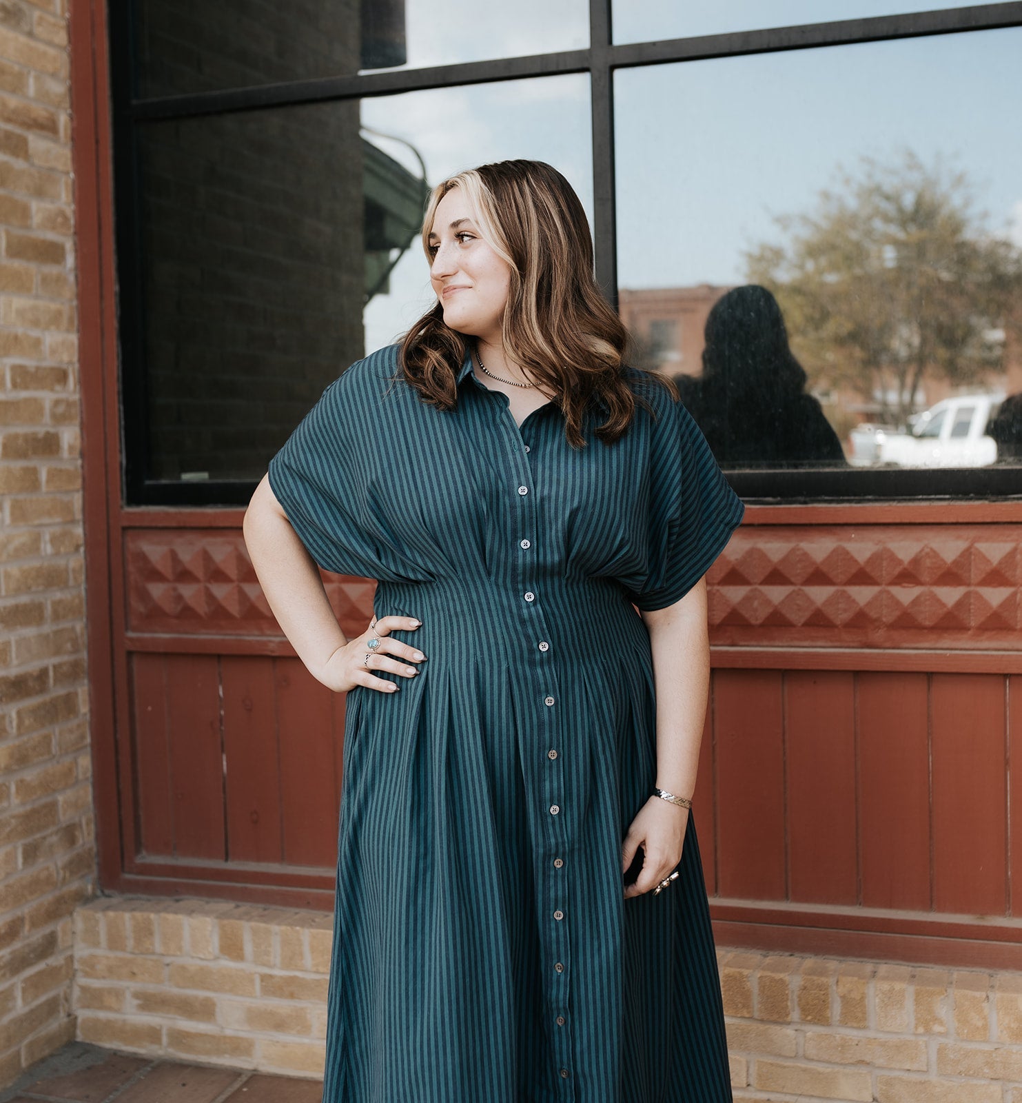 Meet your new go-to for effortless elegance — the Deep Teal Stripe Plissé Dress. With its soft pleated texture, rich jewel-tone teal, and flowy silhouette, this piece is perfect for dressing up without ever feeling overdone. It moves beautifully, buttons all the way down, and brings a flattering shape that works for so many occasions.