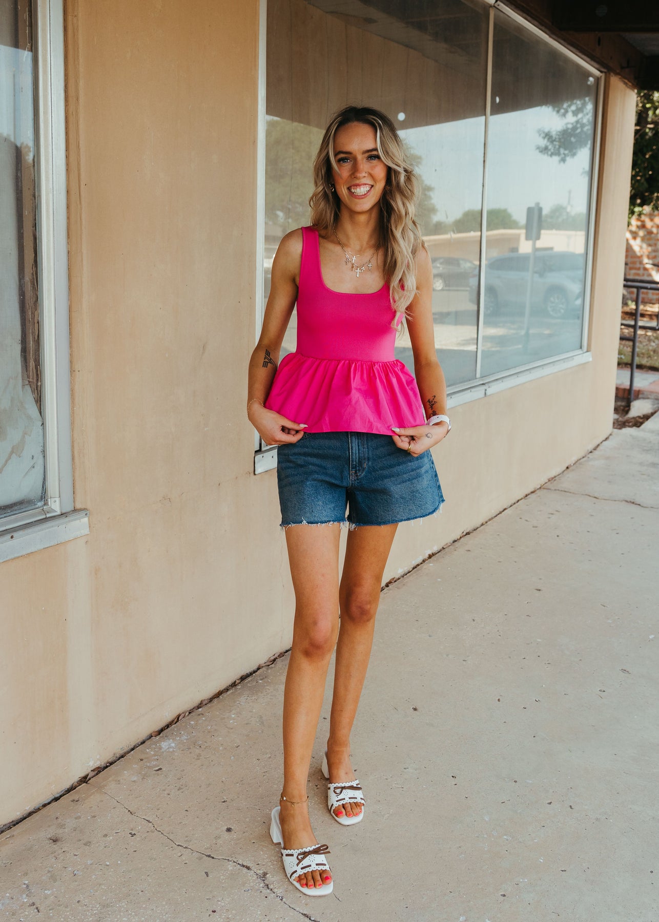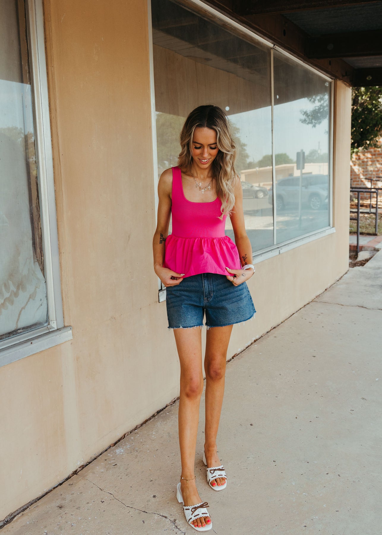 Bold, bright, and made for sunshine days! This eye-catching sleeveless top features a flattering square neckline and a flouncy peplum-style hem that brings the fun. Made from 100% cotton, the top is super stretchy for a comfy, flexible fit that moves with you.