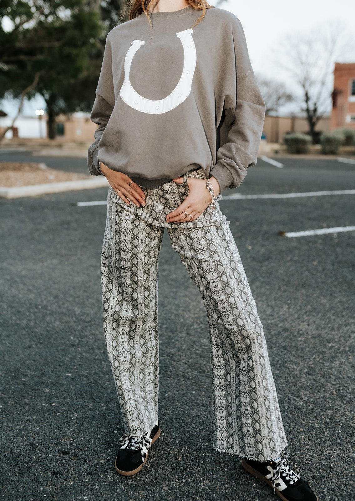 Statement-making with the perfect amount of stretch. These grey snake print pants feature a flattering high-rise fit and a wide leg silhouette that elevates any outfit.