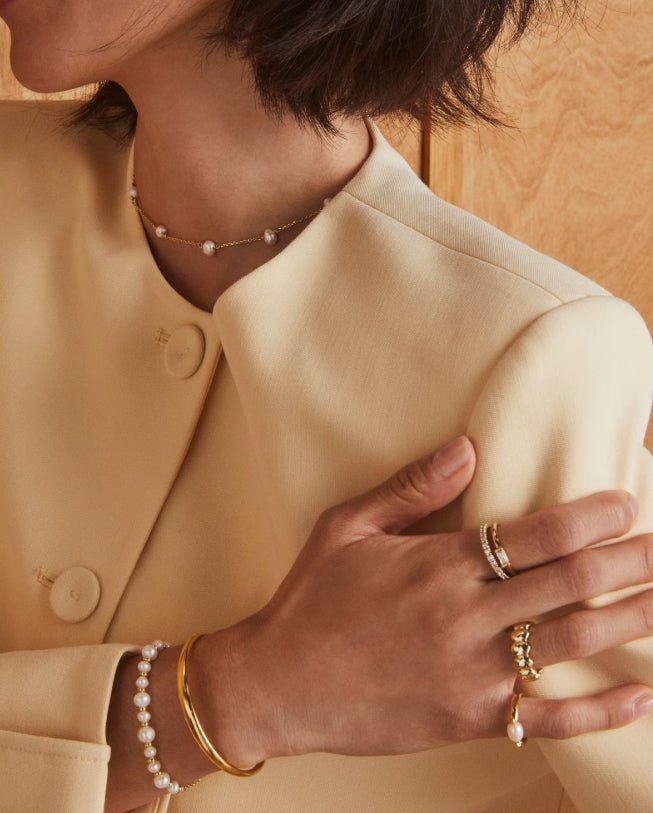 An easy way to elevate your everyday stack. The Jovie bracelet blends soft pearl shine with delicate gold beading for a look that feels polished but never overdone—perfect for busy days when you still want something special on your wrist.