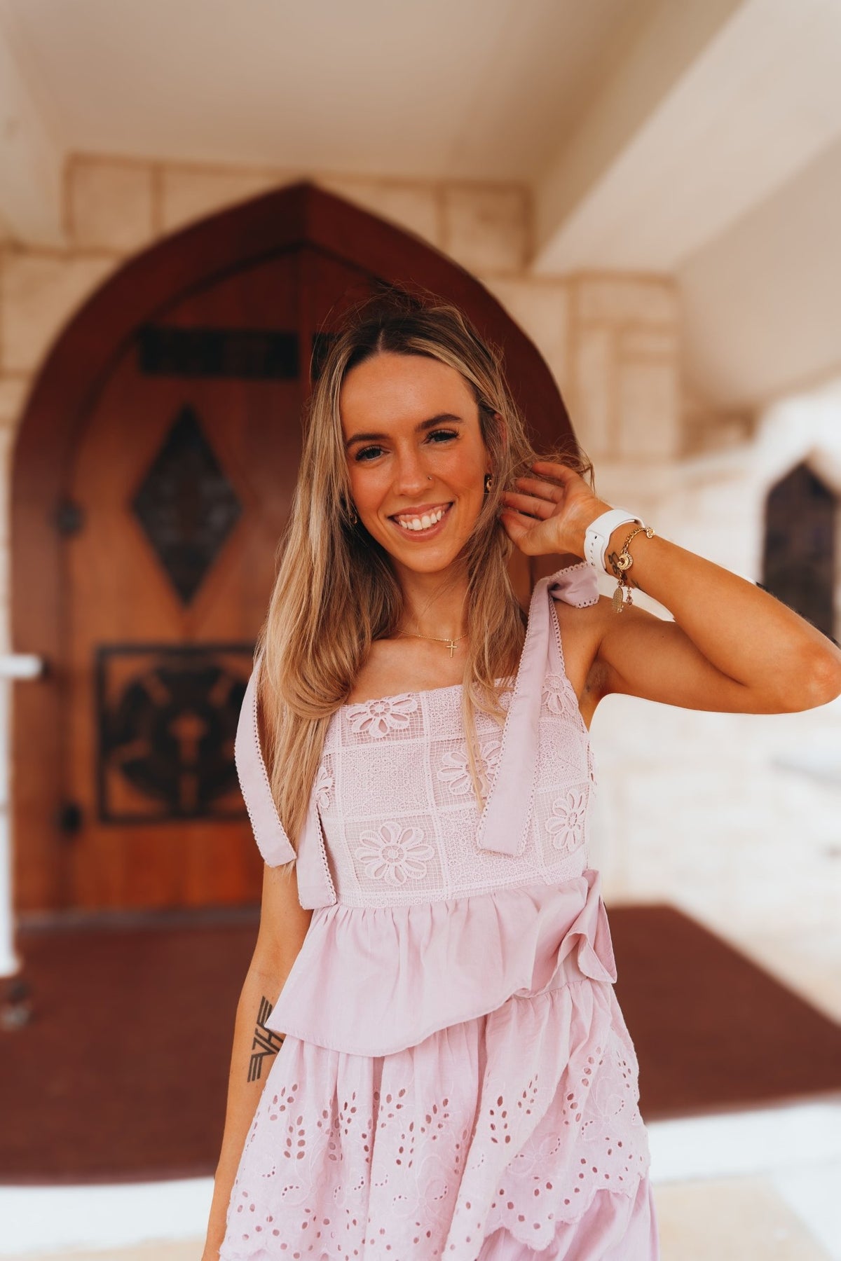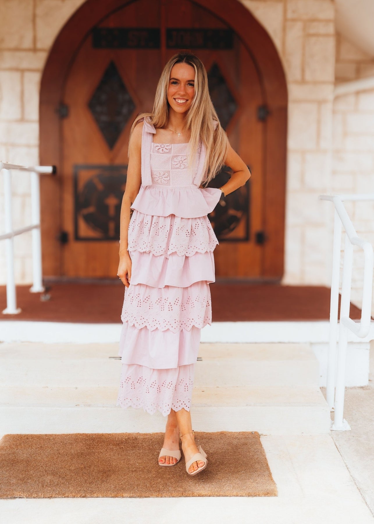 Romantic, feminine, and oh-so-dreamy This light mauve maxi dress features an eye-catching crochet design and scalloped eyelet tiers for a whimsical, layered look. Adjustable tie straps and an elastic smocked back offer a flattering fit with extra comfort. The full lining keeps it breezy and modest, making it perfect for garden parties, showers, or Sunday best.