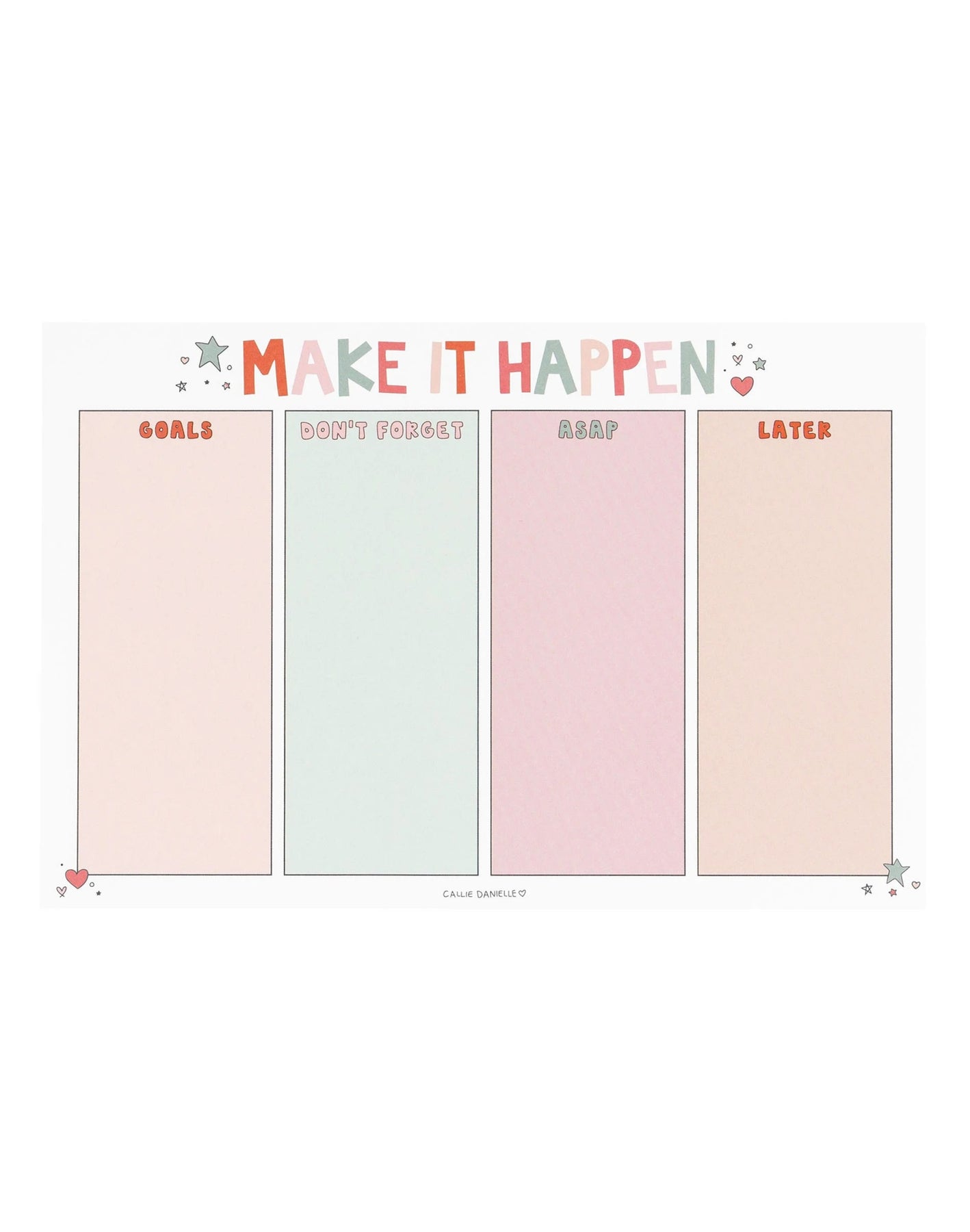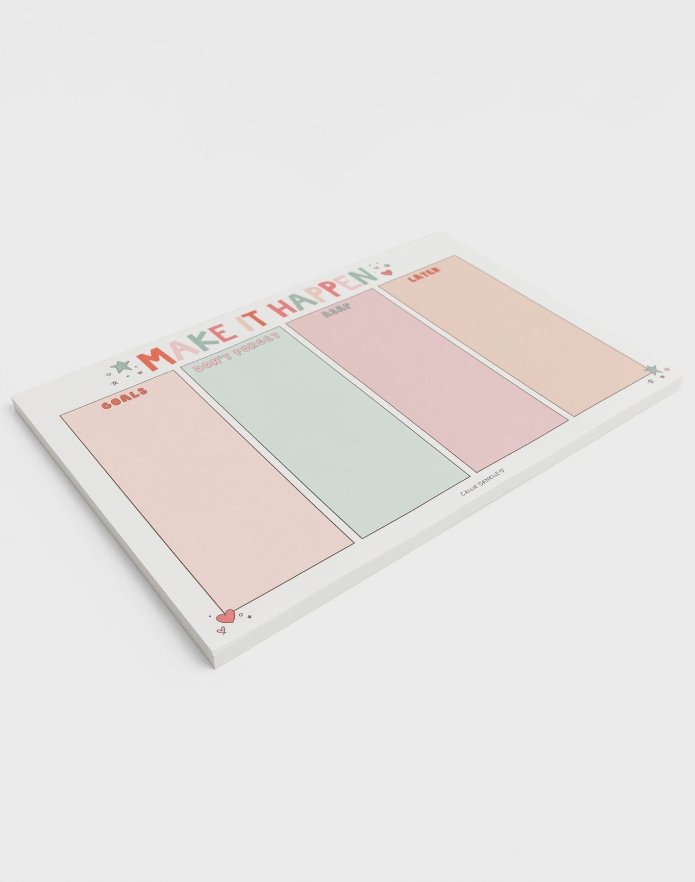 Keep track of goals, tasks and to-do lists with our Make It Happen Notepad. The soft colors and doodles are sure to motivate teachers and students to plan ahead and stay on schedule, making it the perfect gift for teacher appreciation or back to school season. With columns dedicated to goals, reminders, ASAP tasks and lower priority to-dos for later, this 52-page notepad makes it easy and fun to stay organized week after week for an entire year.