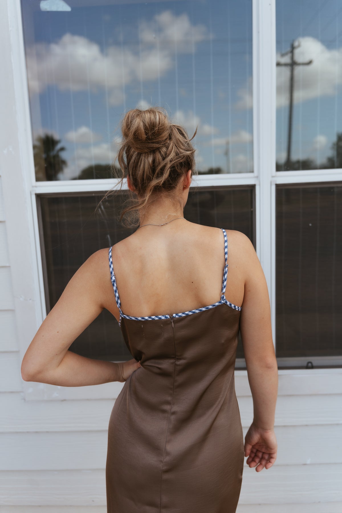 Sleek, simple, and effortlessly chic—this satin maxi dress is the definition of understated elegance. The mocha sheen paired with contrast trim straps makes it versatile enough to dress up or down.
