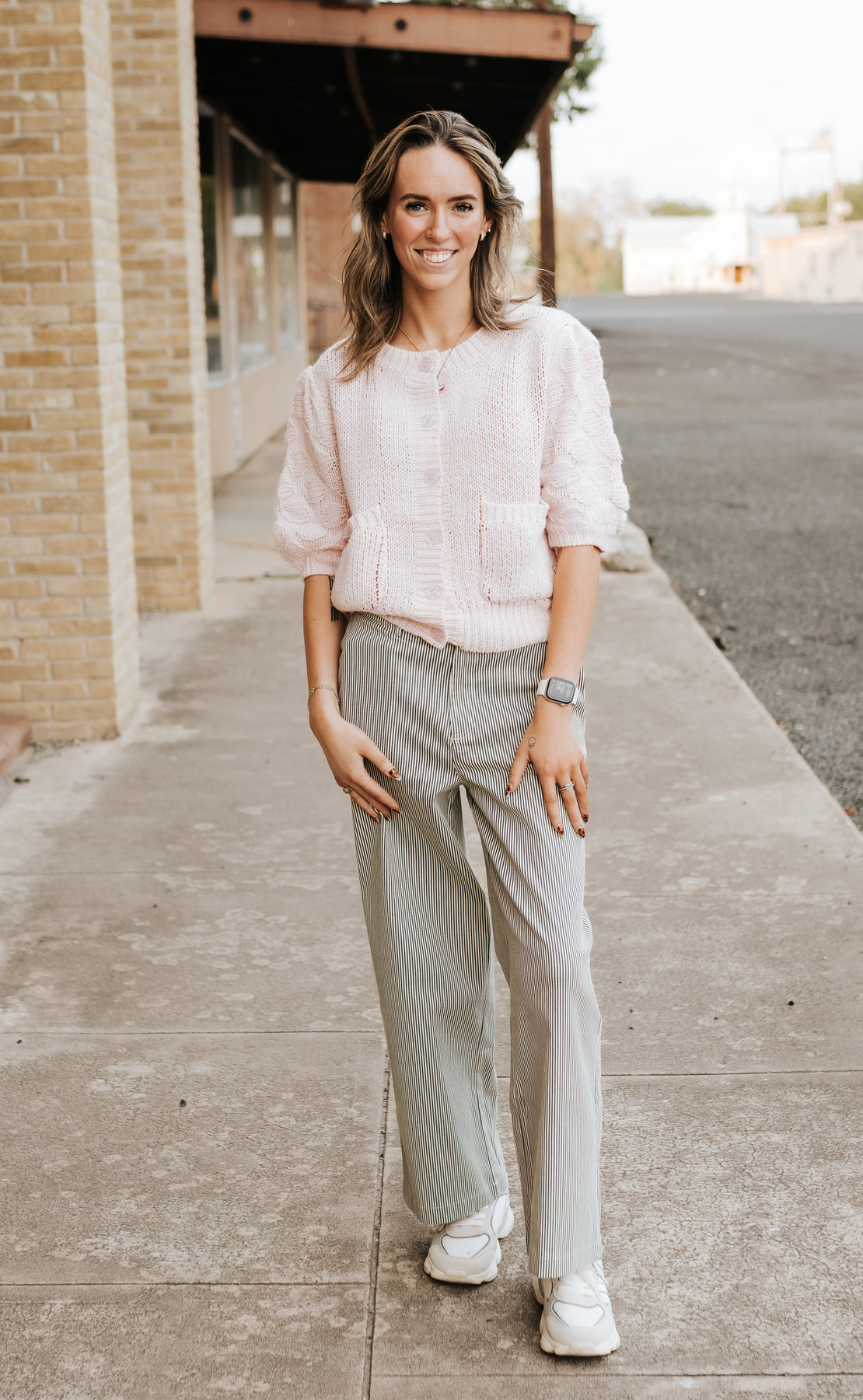 Make a playful statement with this pink knit cardigan — featuring a bold red lobster design on the back for a fun coastal touch. With its soft knit texture and bubble sleeves, it strikes the perfect balance between quirky and cozy.