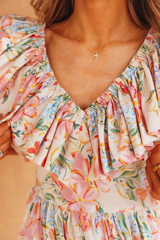 Say hello to your next favorite floral! The Dana Mini Dress stuns with its soft pink multi print, ruffle neckline, tiered skirt, and whimsical bubble sleeves. Made from 100% cotton, it’s fully lined and features hidden side pockets and a zip closure for an easy, flattering fit.