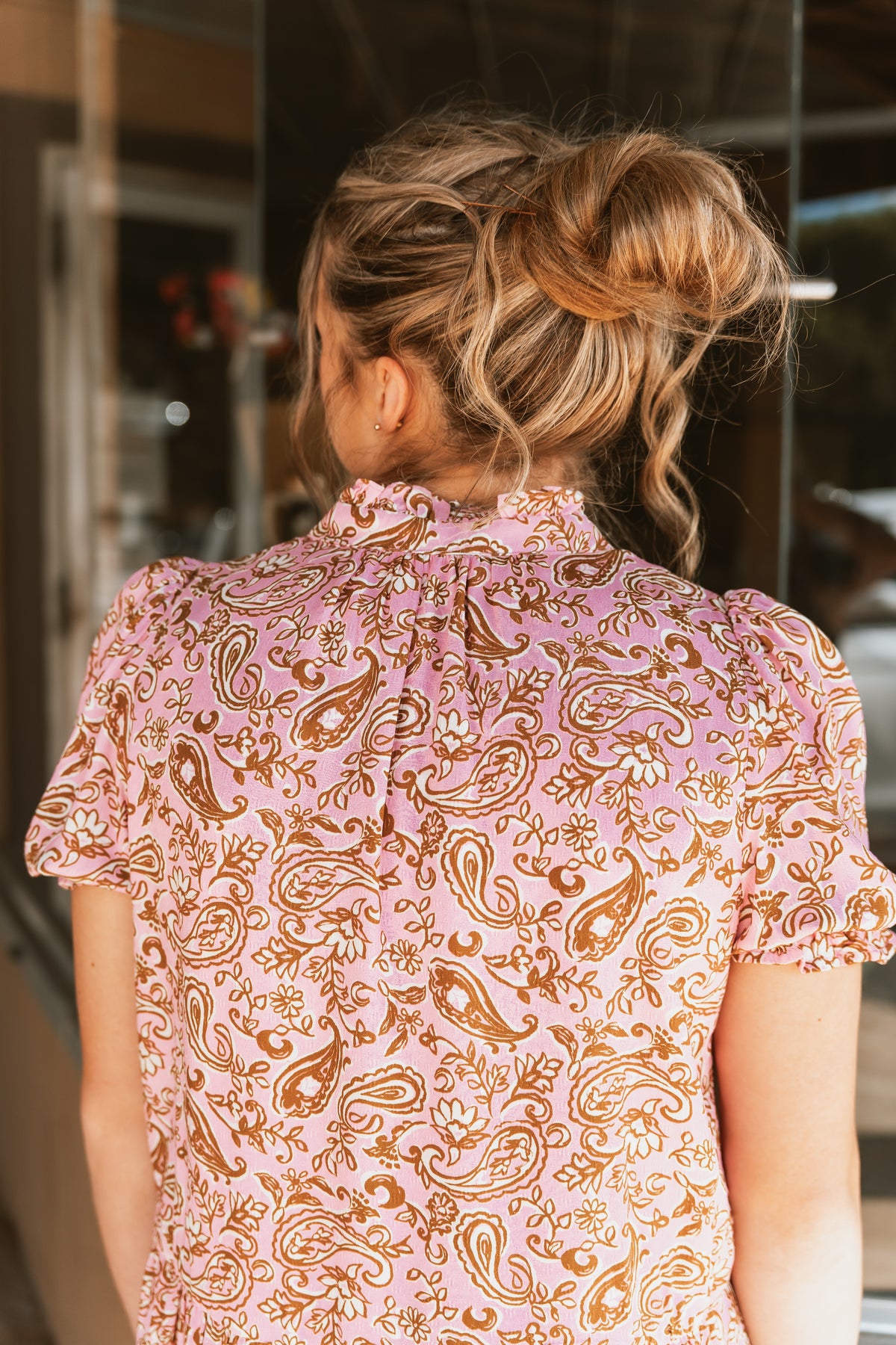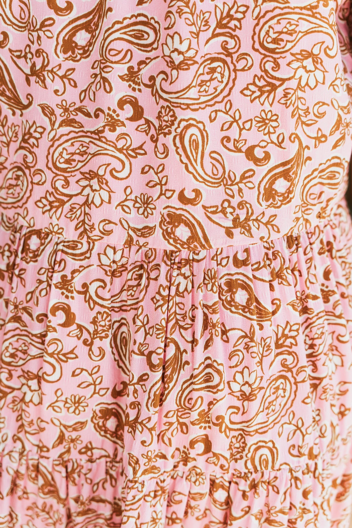 Feminine and fun, this mini dress is made for sunny days and special moments. With its soft pink paisley print, tiered skirt, and ruffled details, it’s the perfect mix of playful and polished.