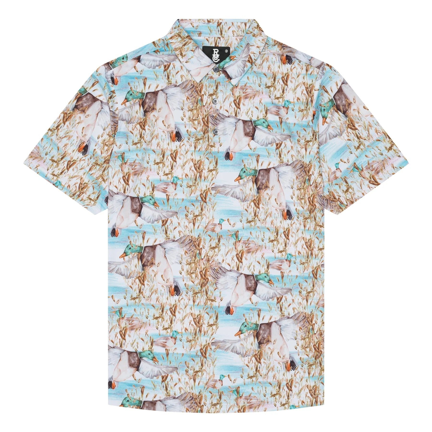 The Mallard duck polo features a hand painted pattern, laser engraved buttons, and an embroidered RBC brand logo on the back neck.