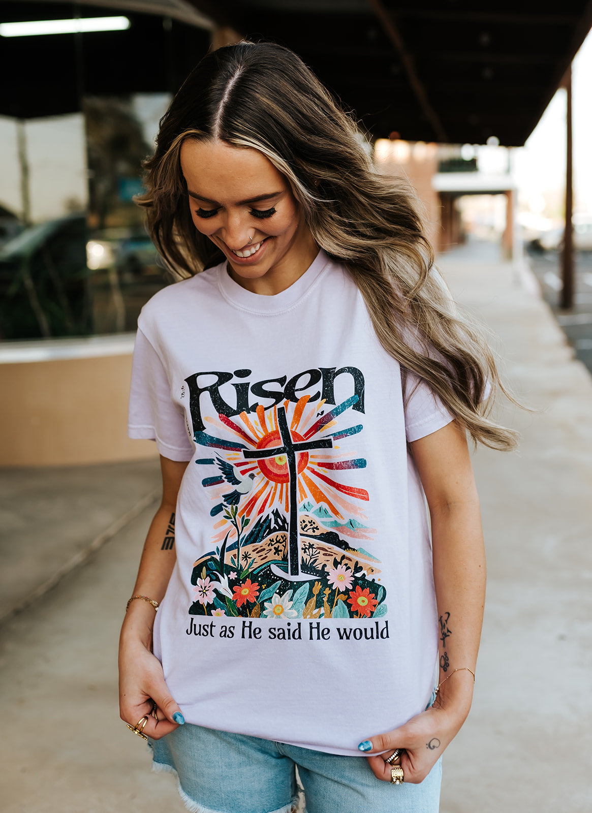 Faith and style come together in the Risen Just As He Said Christian Tee. Designed on a soft orchid colored tee, this graphic features a bold cross with a vibrant sunrise scene, floral details, and the message “Risen” across the top with “Just as He said He would” printed below. The meaningful design creates a beautiful reminder of faith while keeping the look comfortable and easy to wear.