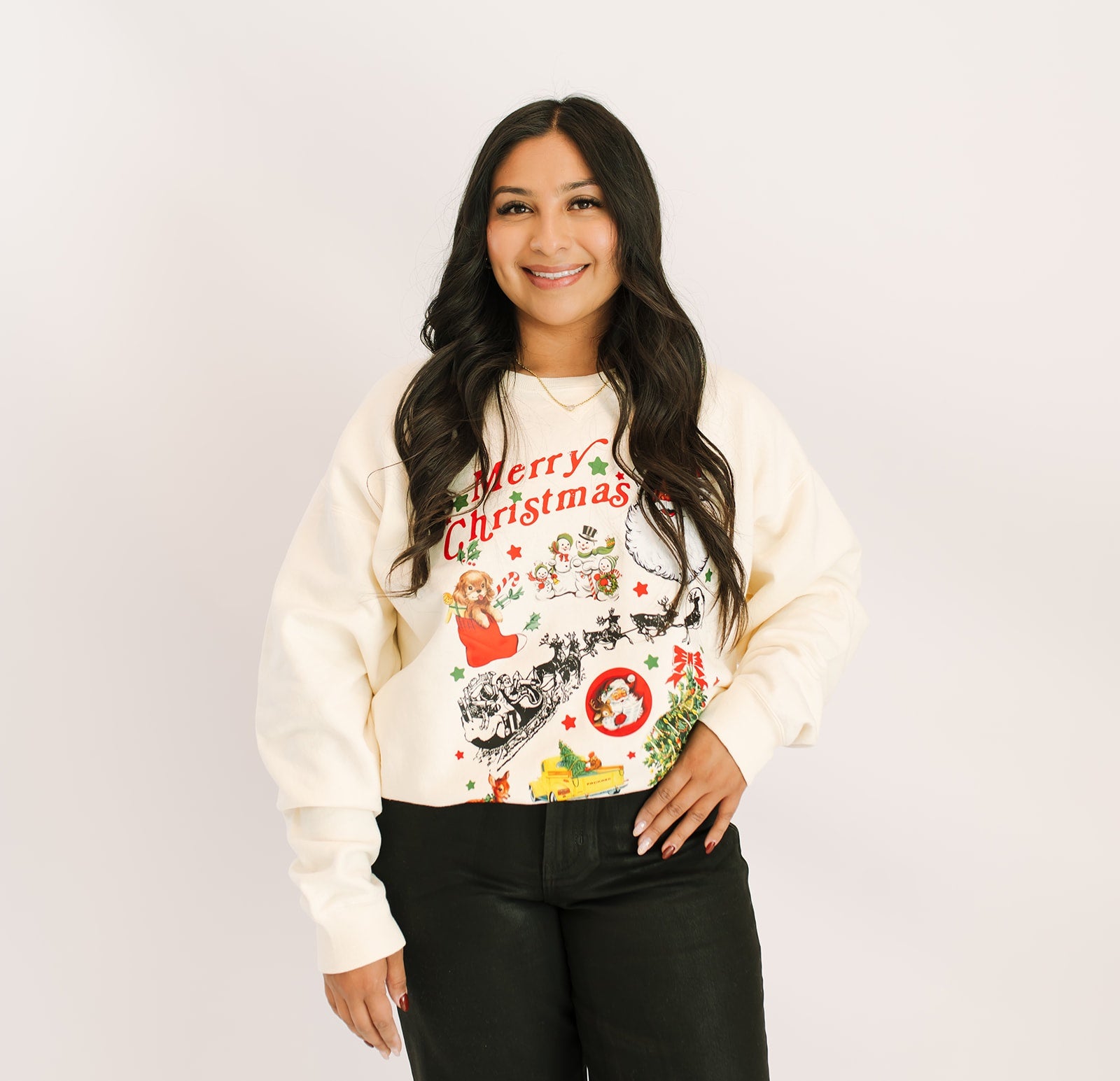 Get into the holiday spirit with our Santa’s Sleigh Sweatshirt! Featuring a nostalgic vintage-inspired print with Santa, snowmen, and classic Christmas motifs, this cozy ivory pullover is the perfect mix of comfort and festive cheer.