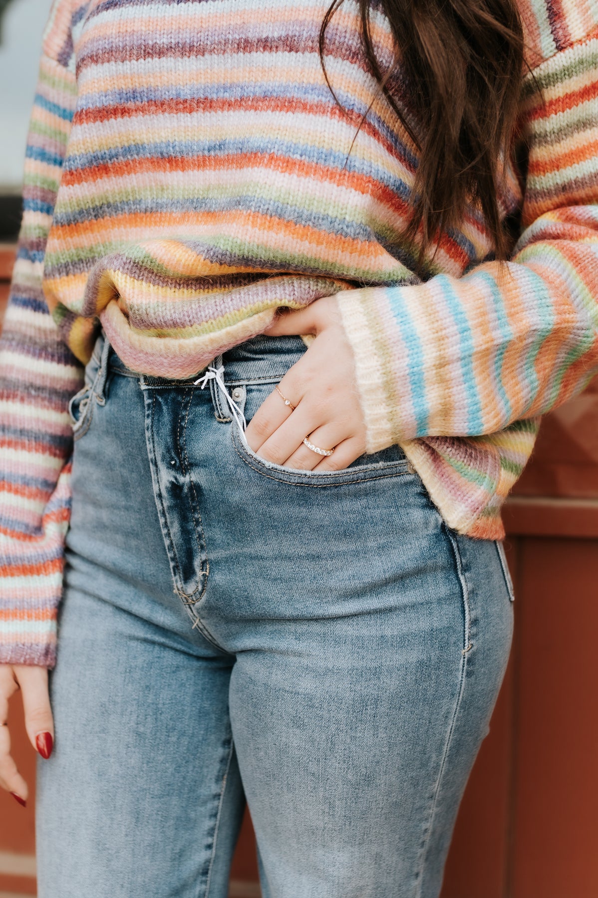 Brighten up any day with this colorful striped sweater. Soft and lightweight with a relaxed fit, it blends cheerful hues of sky blue, purple, coral, and mint for the perfect pop of color. Ideal for layering or wearing solo, it’s as cozy as it is eye-catching.