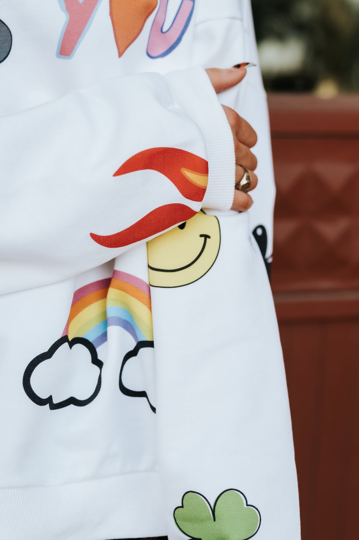 Feel-good vibes only. This playful graphic sweatshirt spreads a little sunshine wherever you go with its bold, colorful lettering and fun retro-inspired graphics (hello, tiger and smiley!). Designed for comfort and style, it’s perfect for casual days, lounging, or layering with your favorite denim.