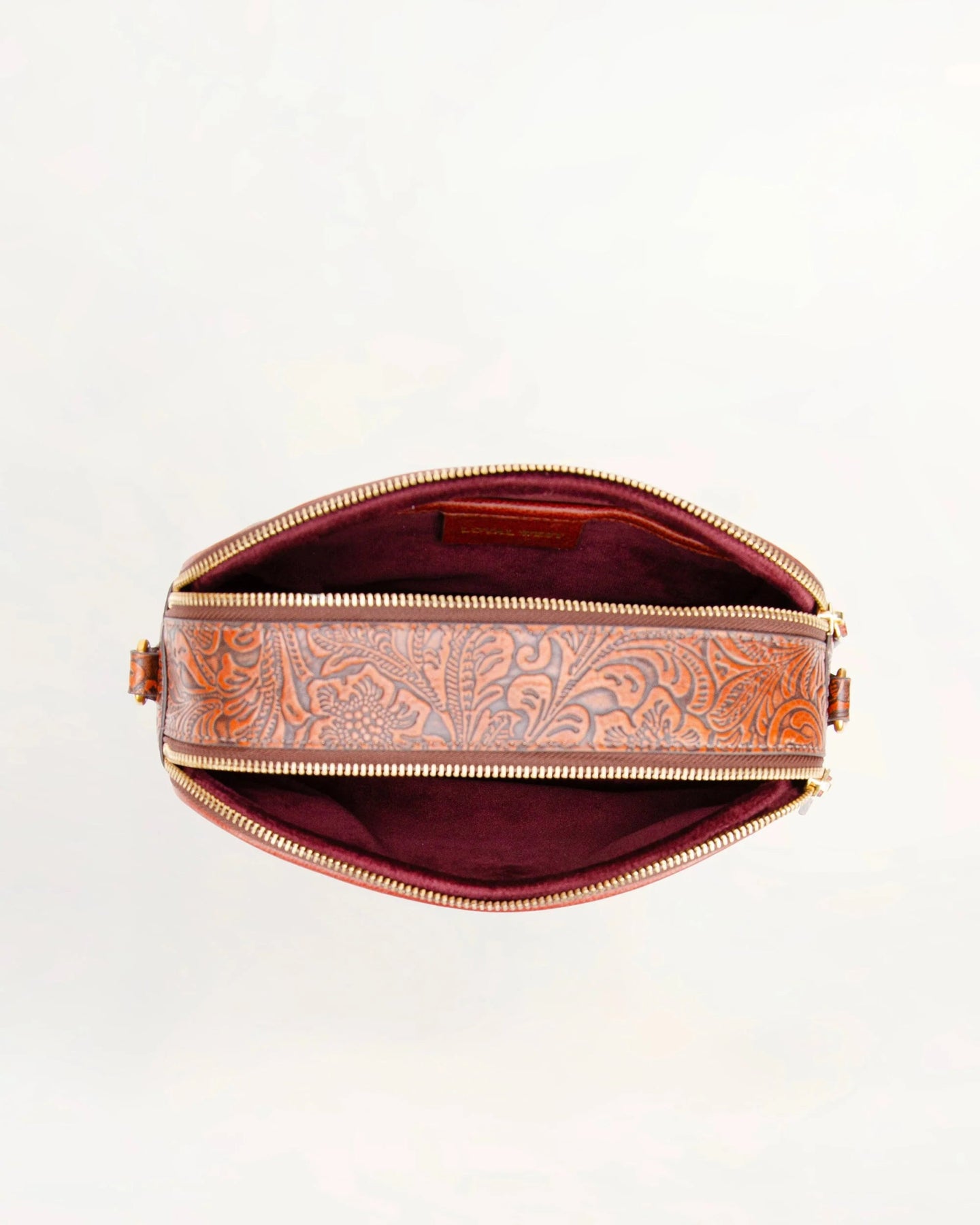 The Sophia Shoulder Bag in brown embossed calfskin combines a rich floral pattern with elegant design details, making it a standout crossbody bag. Featuring a removable strap, golden hardware, and a heart-shaped mirror bag charm, it offers both practicality and style.