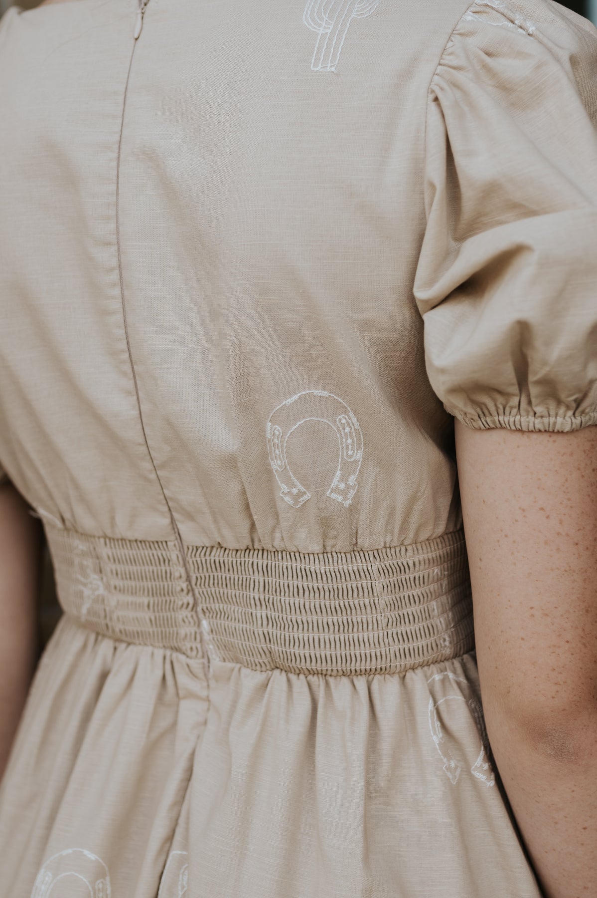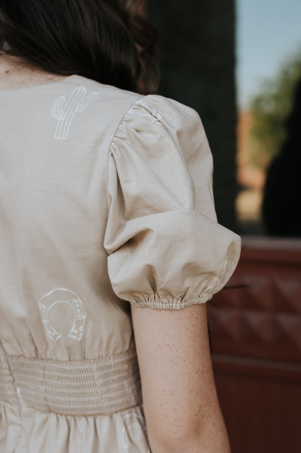Soft, timeless, and effortlessly elegant — this taupe maxi dress blends western charm with a feminine touch. With puff sleeves, a flattering waistline, and subtle embroidered detailing, it’s made for everything from brunch to fall weddings.