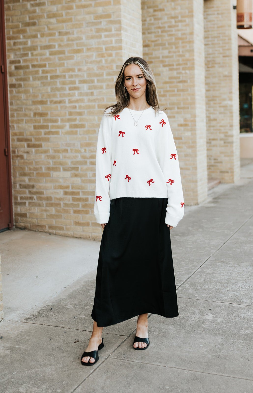 Go full holiday chic by pairing it with our satin midi skirt and simple black heels — effortless, polished, and so cute for photos or parties.