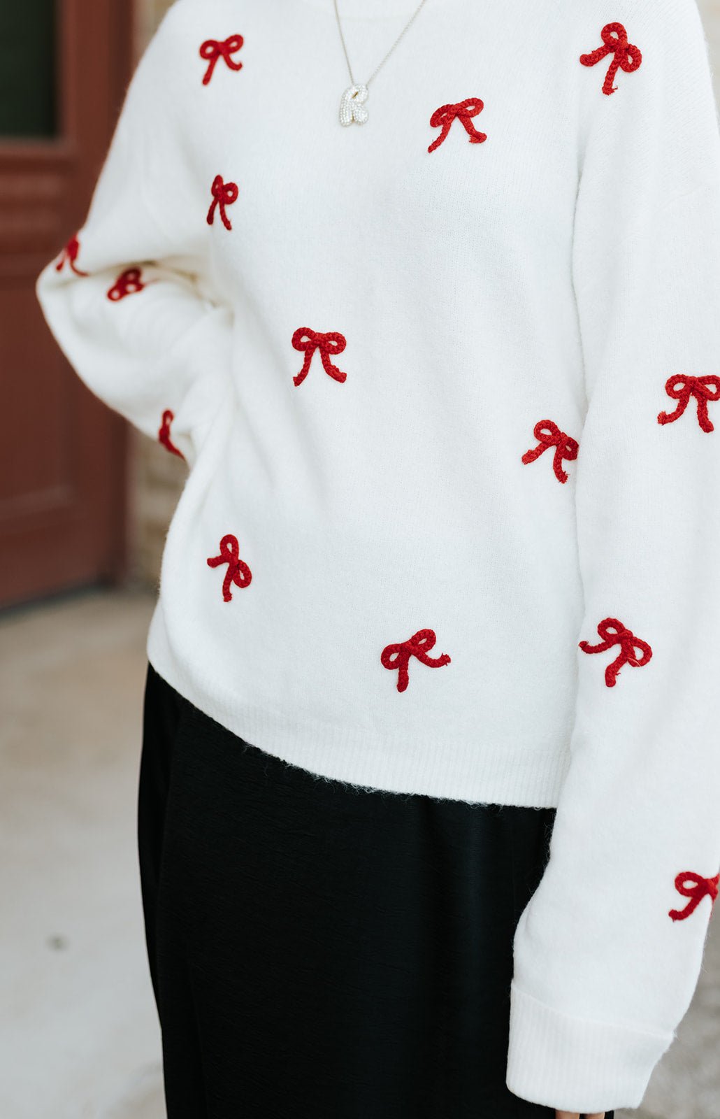 Sweet, festive, and so easy to wear — the Tie The Ribbon Sweater brings a playful pop to your winter wardrobe. With its soft knit and adorable embroidered bows, this sweater is the perfect mix of cozy and cute for the holiday season.