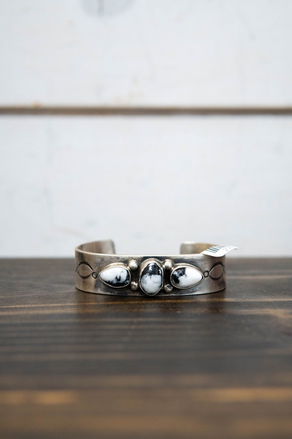 Bold. Balanced. Beautiful. This wide sterling silver cuff showcases a striking trio of genuine White Buffalo stones—each one unique with marbled black and white patterns. The mix of pear and oval cuts gives it an artful edge, while hand-stamped details add that touch of timeless craftsmanship.
